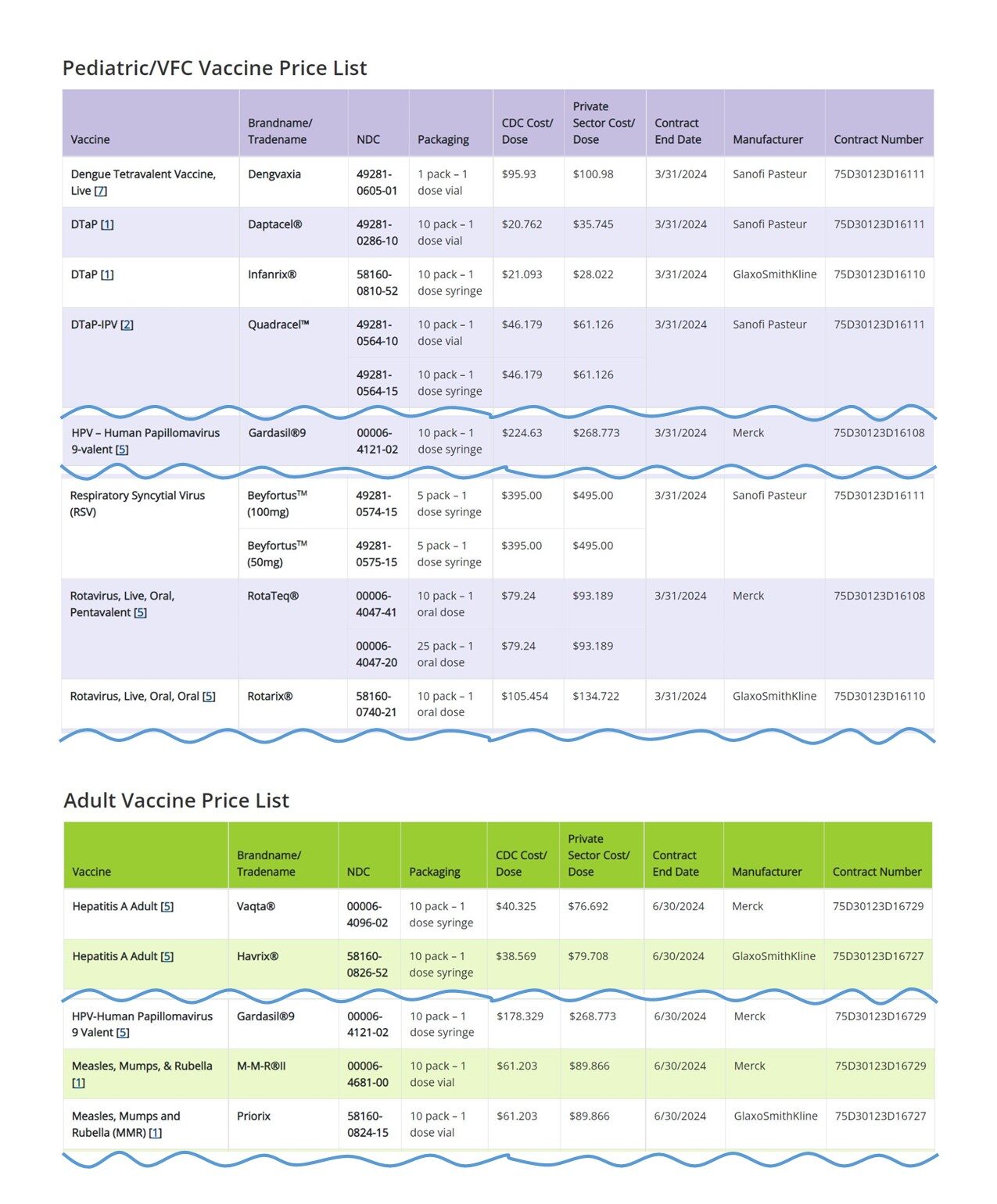 The complete pediatric and adult price lists, including for COVID vaccines, can be found at: https://www.cdc.gov/vaccines/programs/vfc/awardees/vaccine-management/price-list/index.html
