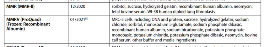 What’s in the vaccine? Below are the vaccine excipients for the current MMR vaccines from page 9 of the CDC’s pink book: