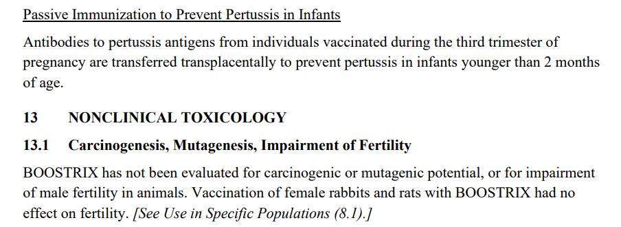 Below is the screenshot for Section 13.1 of the vaccine package insert for the TDaP vaccine, Boostrix, recommended for individuals 10 years and above, including pregnant women. It states that it was not tested in animals for its ability to cause cancer or genetic mutations. It was only tested on female animals, not males, for impairment of fertility.