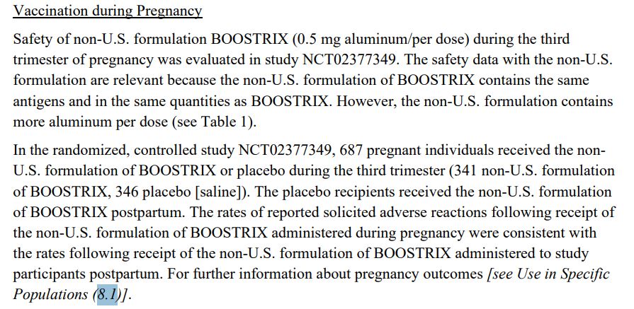 According to the insert, human data (p17) from the U.S. pregnancy exposure registry indicated that women who received the vaccine during the trial were followed for 17 years with no major birth defects reported. However, of the 1523 prospective reports of pregnancy, only 256 had known outcomes. Additionally, there was post-marketing data and U.S. spontaneous reports for 810 “prospective reports of exposure to BOOSTRIX during pregnancy,” yet, they only had 138 known pregnancy outcomes.