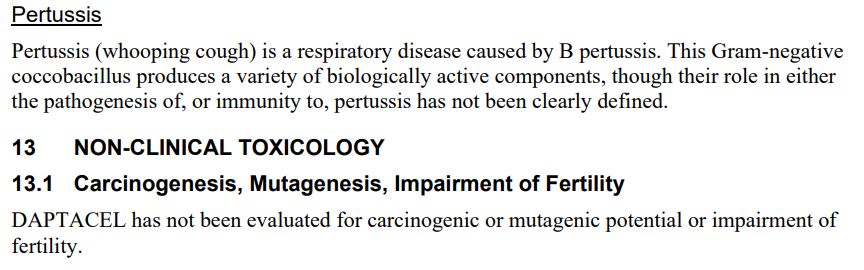 Like most vaccines, the pertussis vaccines have not been tested for the most serious of potential adverse effects – causing cancer, genetic mutations, or impairing the ability to have children. This information is found in Section 13.1 of vaccine package inserts. The following are screenshots of Section 13.1 for the Infranrix and Daptacel vaccines, the two given to newborns and young children.