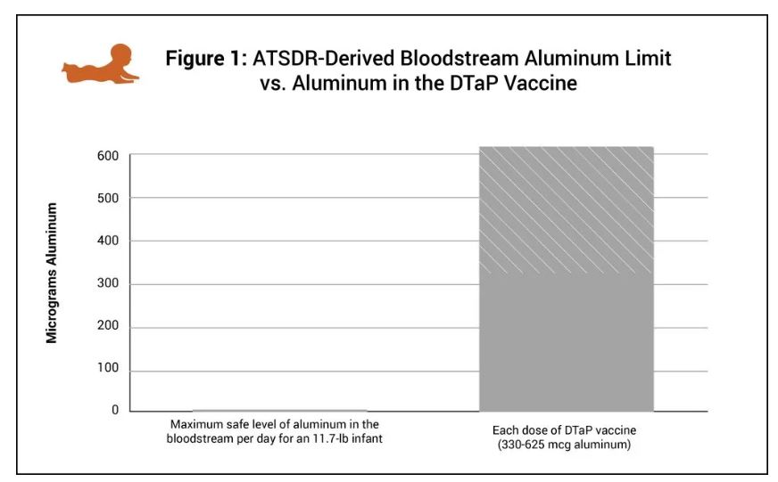 The DTaP vaccine contains 330 mcg to 625 mcg of aluminum, an amount 60 to 120 times greater than the maximum safe level of aluminum in the bloodstream per day for an 11.7-pound (5.3-kilogram) infant, derived from the Agency for Toxic Substances and Disease Registry, a division of the U.S. Department of Health and Human Services (HHS) (Fig. 1).
