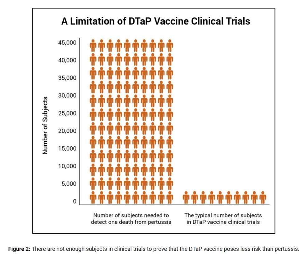 The trials are also too small to determine if the vaccine causes permanent injury or death. PIC notes that the risk of death for infants under one year without mass vaccination is 1 in 46,000. This means that “a few thousand subjects in clinical trials are not enough to prove that the DTaP vaccine causes less permanent injury or death than pertussis.” However, as their graph (below) shows, the trials have only a few thousand subjects compared to the many thousands that would be needed to detect such harms.